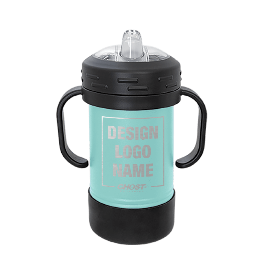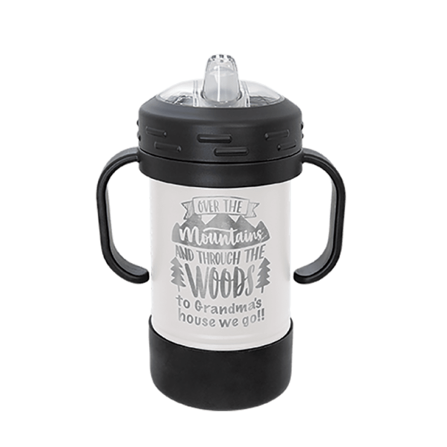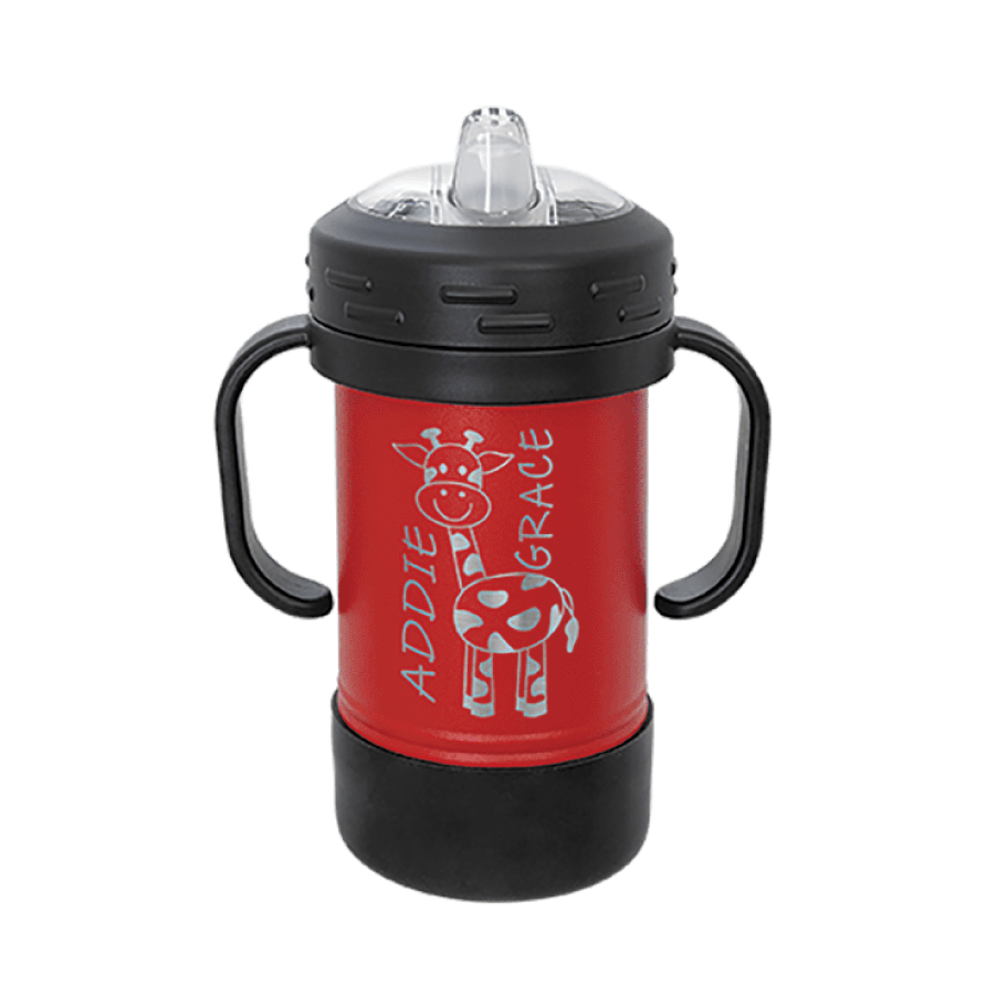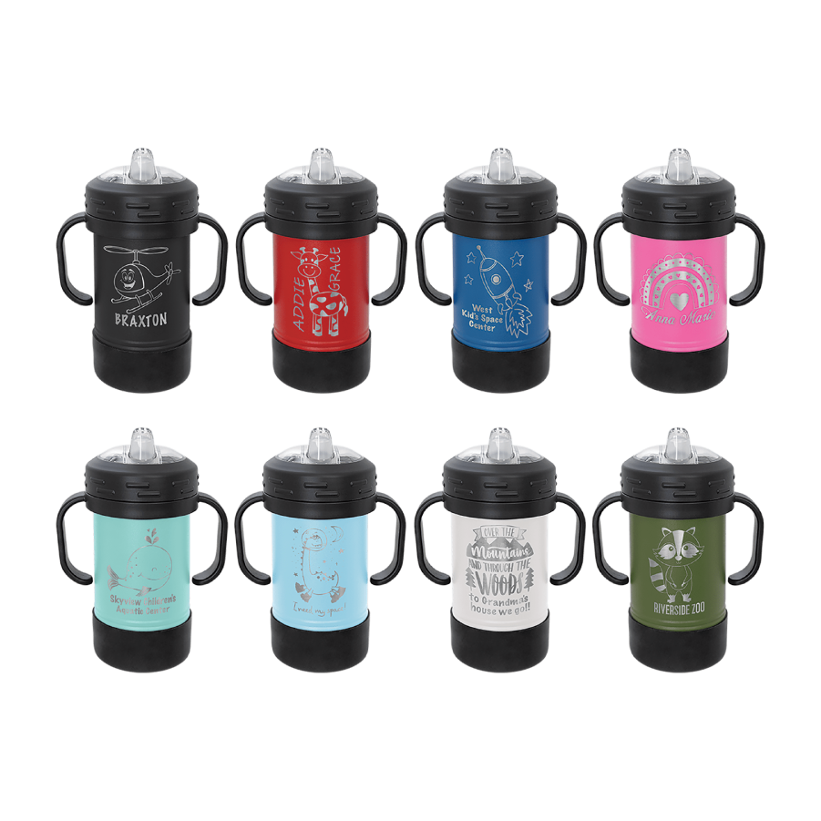 Polar Camel Sippy Cups are 10 oz double wall insulated powder coated cups featuring removable handles, a silicone boot, and spill proof lid. The screw on lid features a hard plastic spout with a rubber leak proof valve. The cup can be used with or without the heavy-duty plastic handles that attach to the lid. They offer plenty of space for personalization and can be taken apart for easy cleaning. The plastic lid may need an occasional deep cleaning.