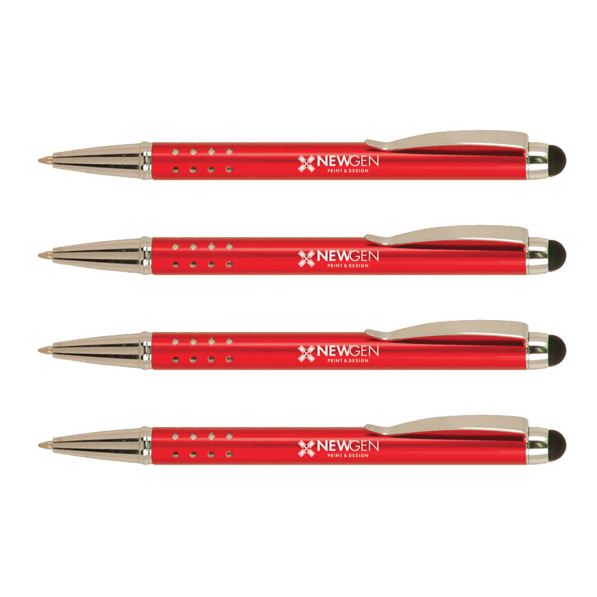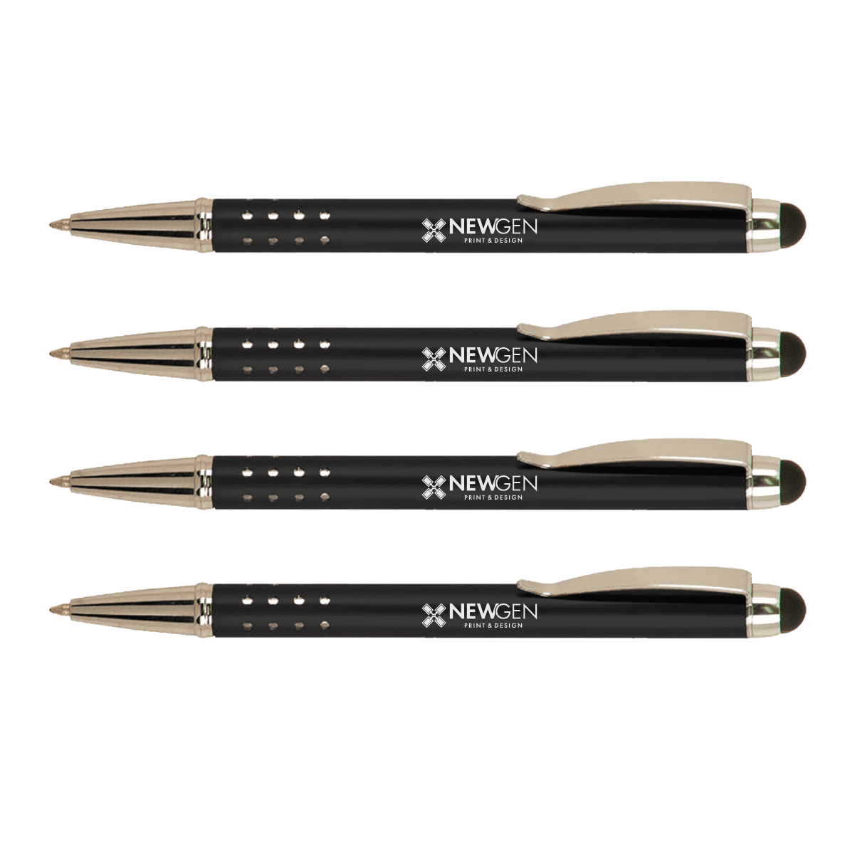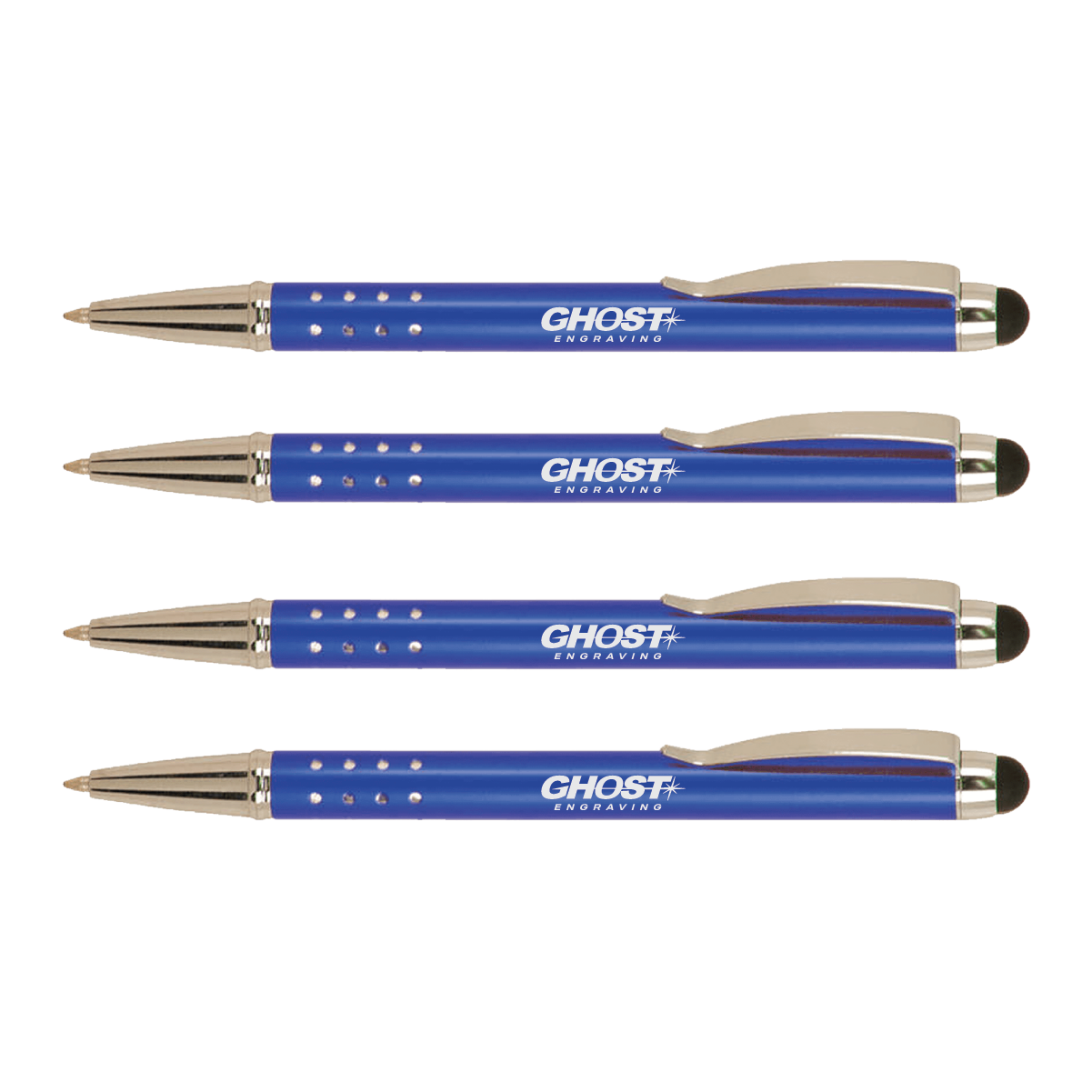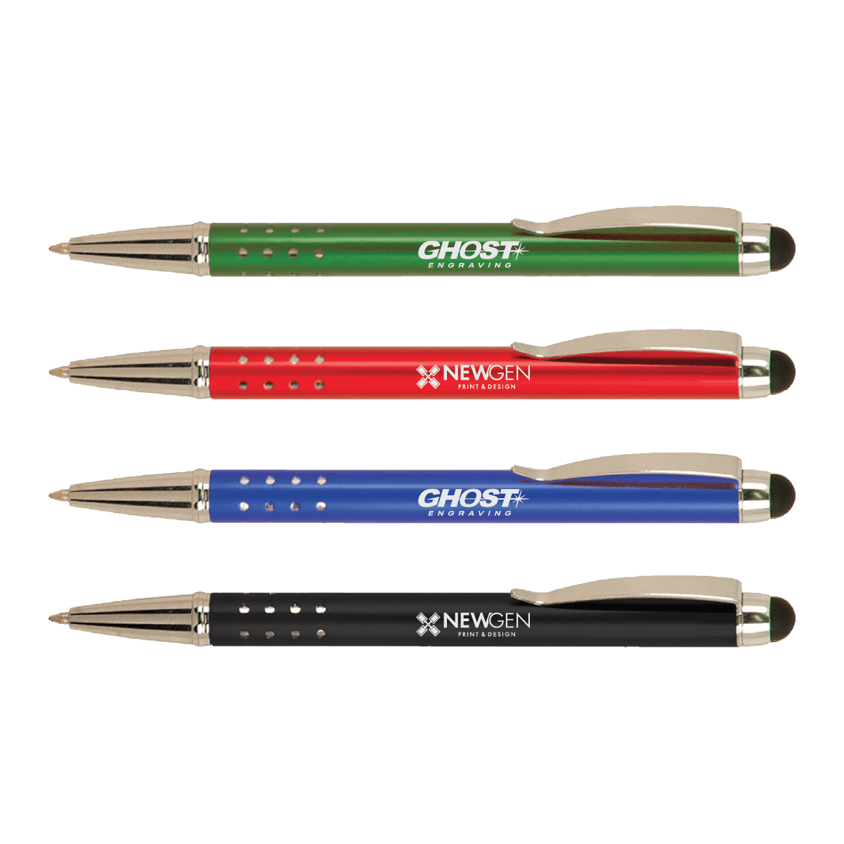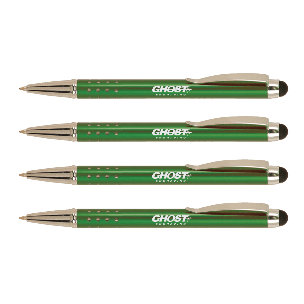 These laserable metal pens feature an anodized aluminum barrel for easy lasering. They have a gloss finish, silver trim and stylus tip with black ink.