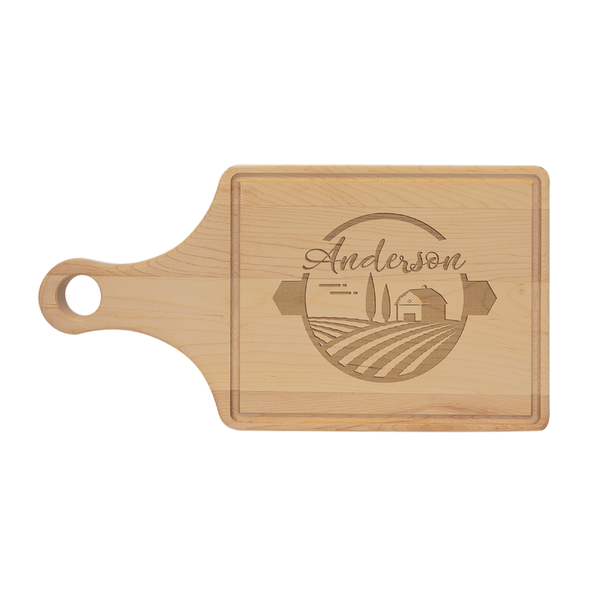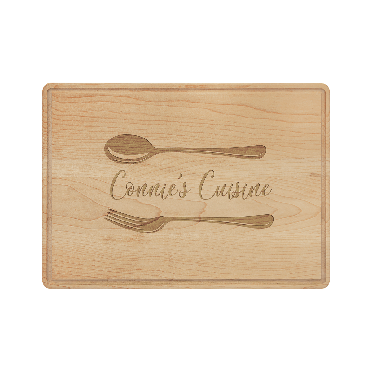This beautiful maple cutting board has a drip ring all around the top to help prevent messes. Cutout handles on bottom of board leave a solid, no hole surface at the top. Personalized, this cutting board is a perfect giftfor any occasion.